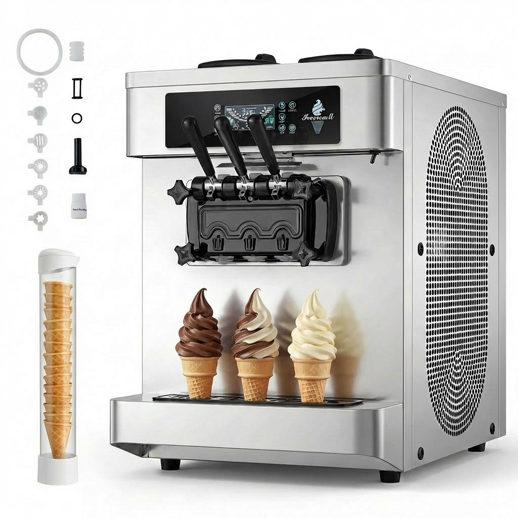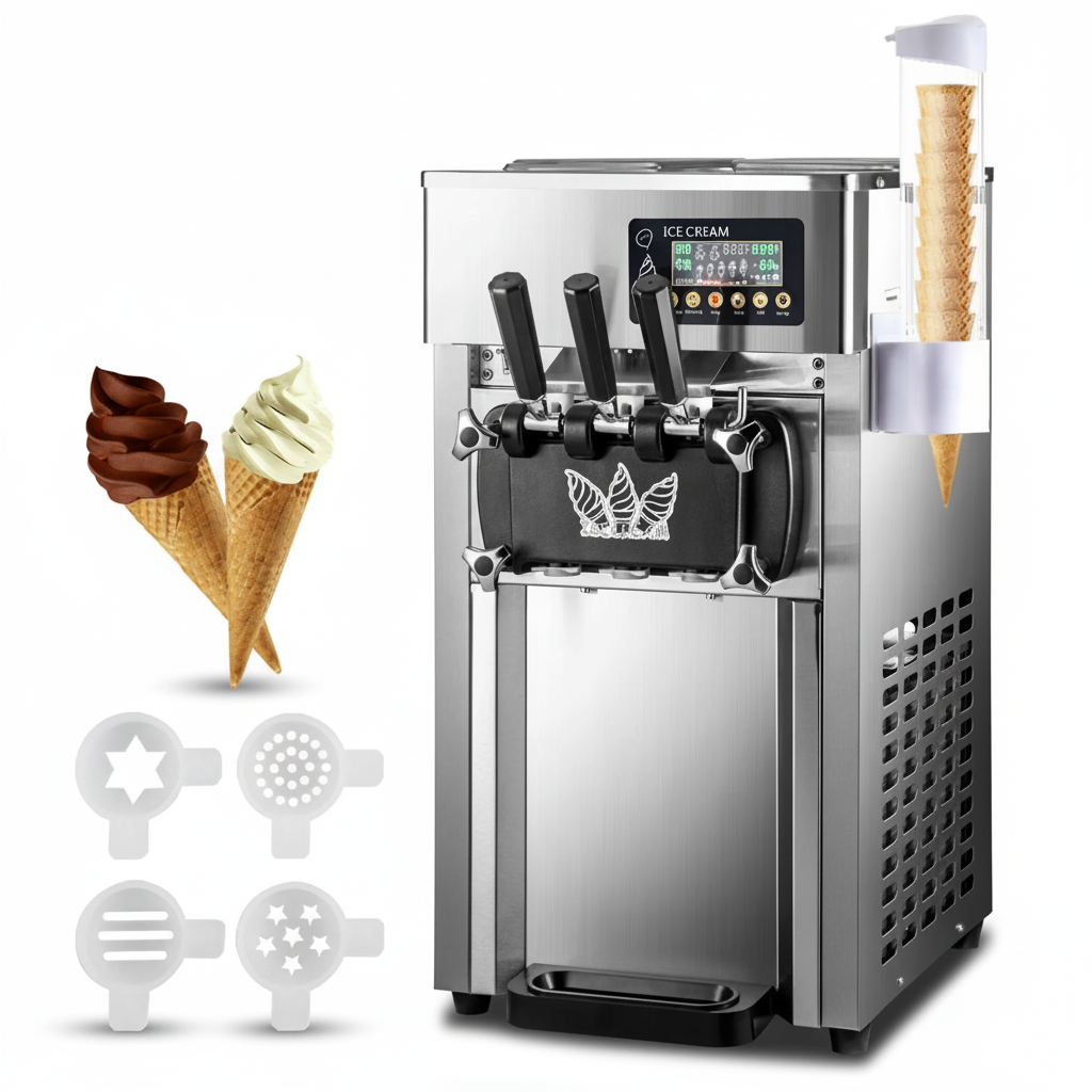 Máquina de Gelados Soft de bancada com 3 maçanetas, pré-resfriamento, Menu Touch e produção até 28L por Hora