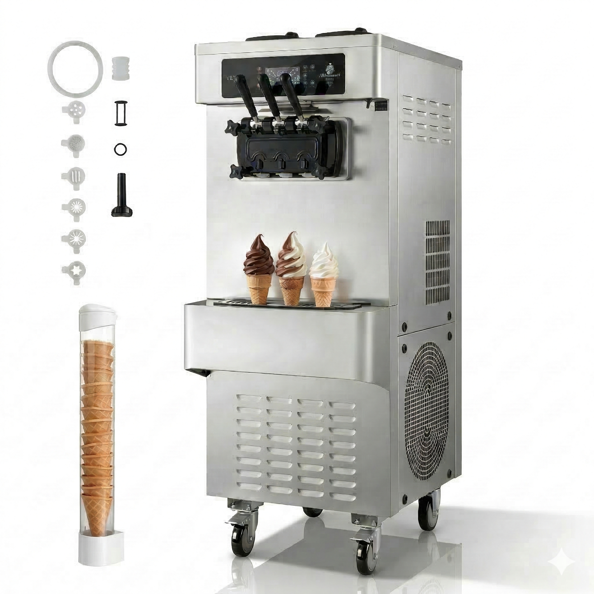 Máquina de Gelados Soft de 3 maçanetas, bomba de ar e com pré-resfriamento, produção até 28L por Hora