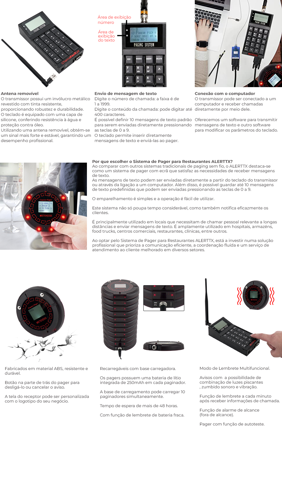 Facilite a comunicação com os seus colaboradores e clientes, através do uso de um pager com ecrã que permite o envio de mensagens de texto. Esta ferramenta revela-se particularmente adequada para a transmissão de informações importantes, como localização de carga e descarga para motoristas de camião, instruções médicas e comunicação entre diferentes balcões em estabelecimentos de take-away, restaurantes e outros estabelecimentos semelhantes.