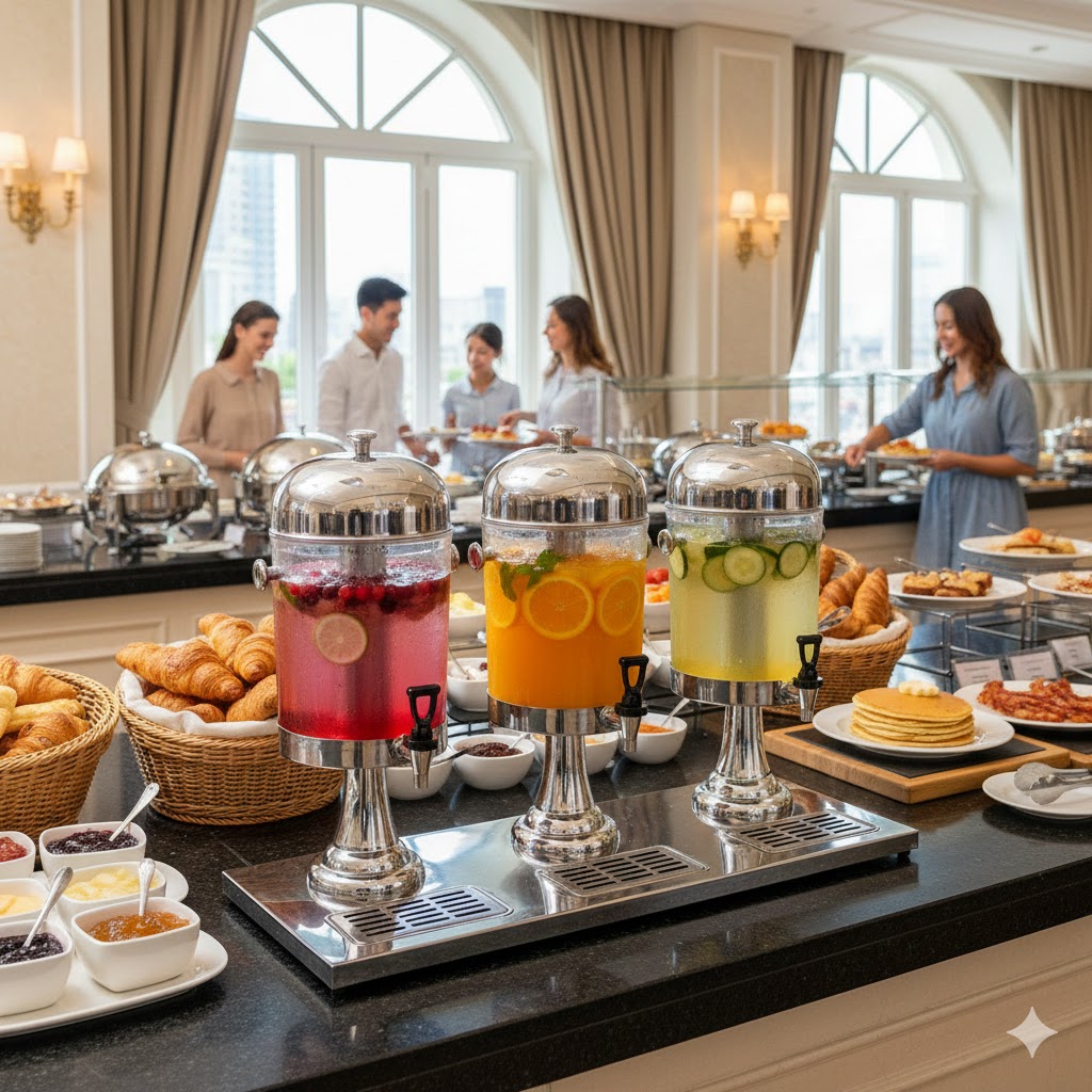 DESIGN PREMIUM PARA HOSPITALIDADE: Acabamento em aço inoxidável de alta qualidade com um estilo retro-clássico. Perfeito para elevar a apresentação de mesas de pequeno-almoço em hotéis, pousadas e áreas VIP de eventos.